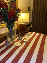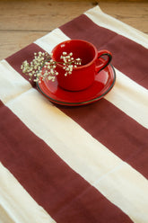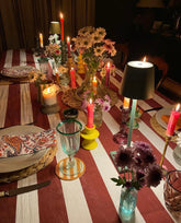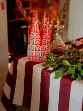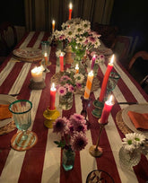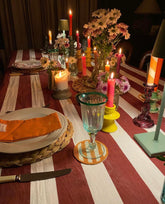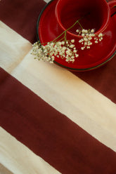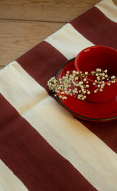 Our tablecloths are beautifully crafted and created in Jaipur using traditional block print techniques. Each tablecloth is hand block printed in a classic wide stripe design. Colour varies between each tablecloth and they measure 3mx1.7m. Perfect for larger gatherings and long tables. 100% cotton.